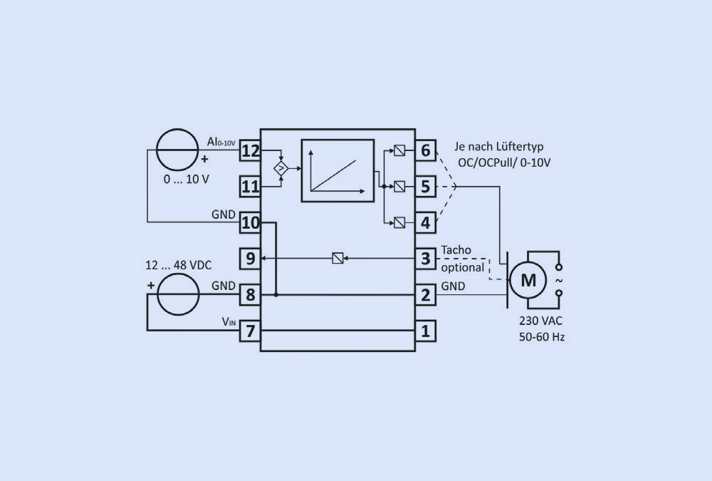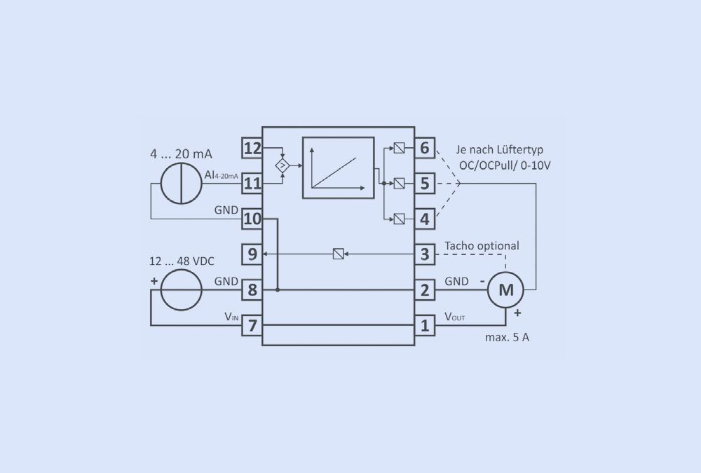 Direct connection of DC fans with up to 5A, AC fans must be supplied separately.